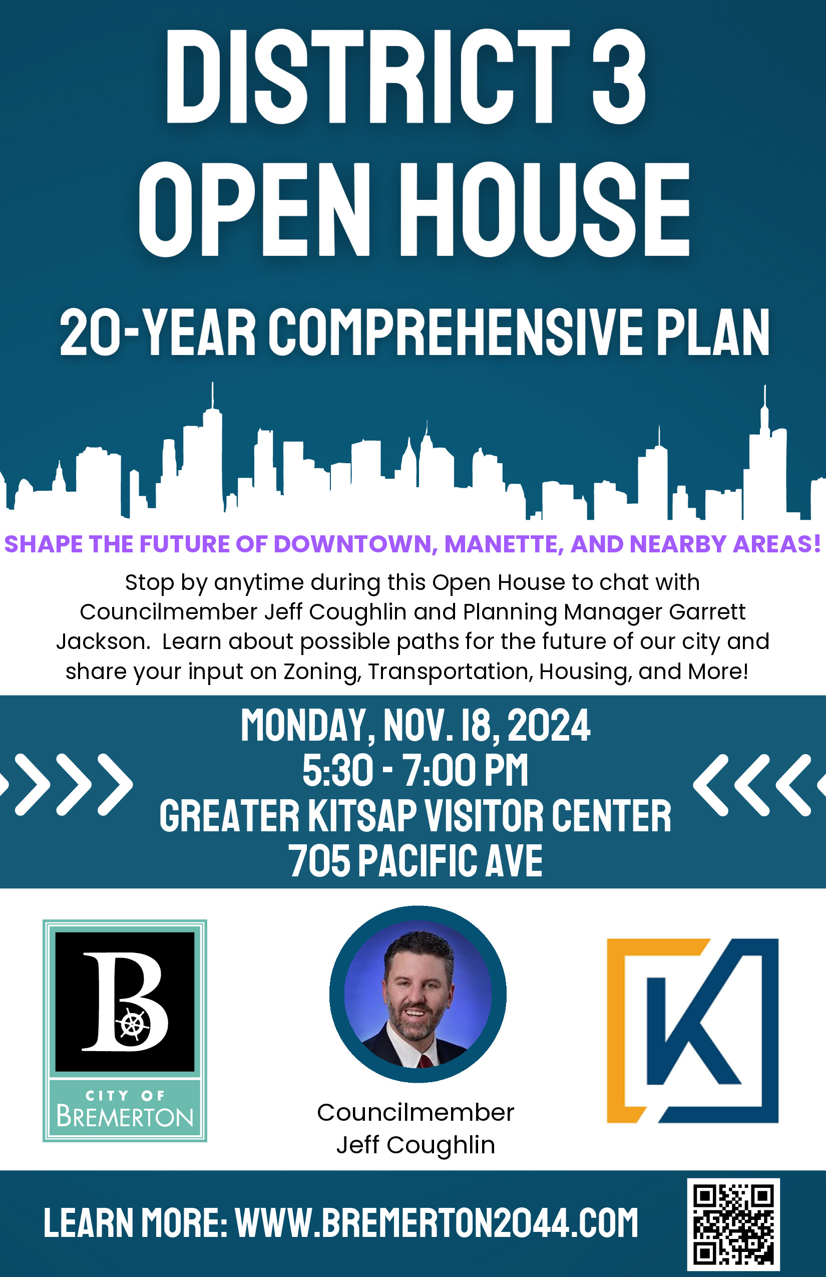 The City completed the Comprehensive Plan update process in June 2025, please visit our Comprehensive Plan webpage to view adopted documents. Bremerton’s Comprehensive Plan provides guidance for how the City will grow and develop over the next 20 years. The Comprehensive Plan is the centerpiece of local planning efforts and relays the goals and policies that will guide the day-to-day decisions of elected officials and local government staff.