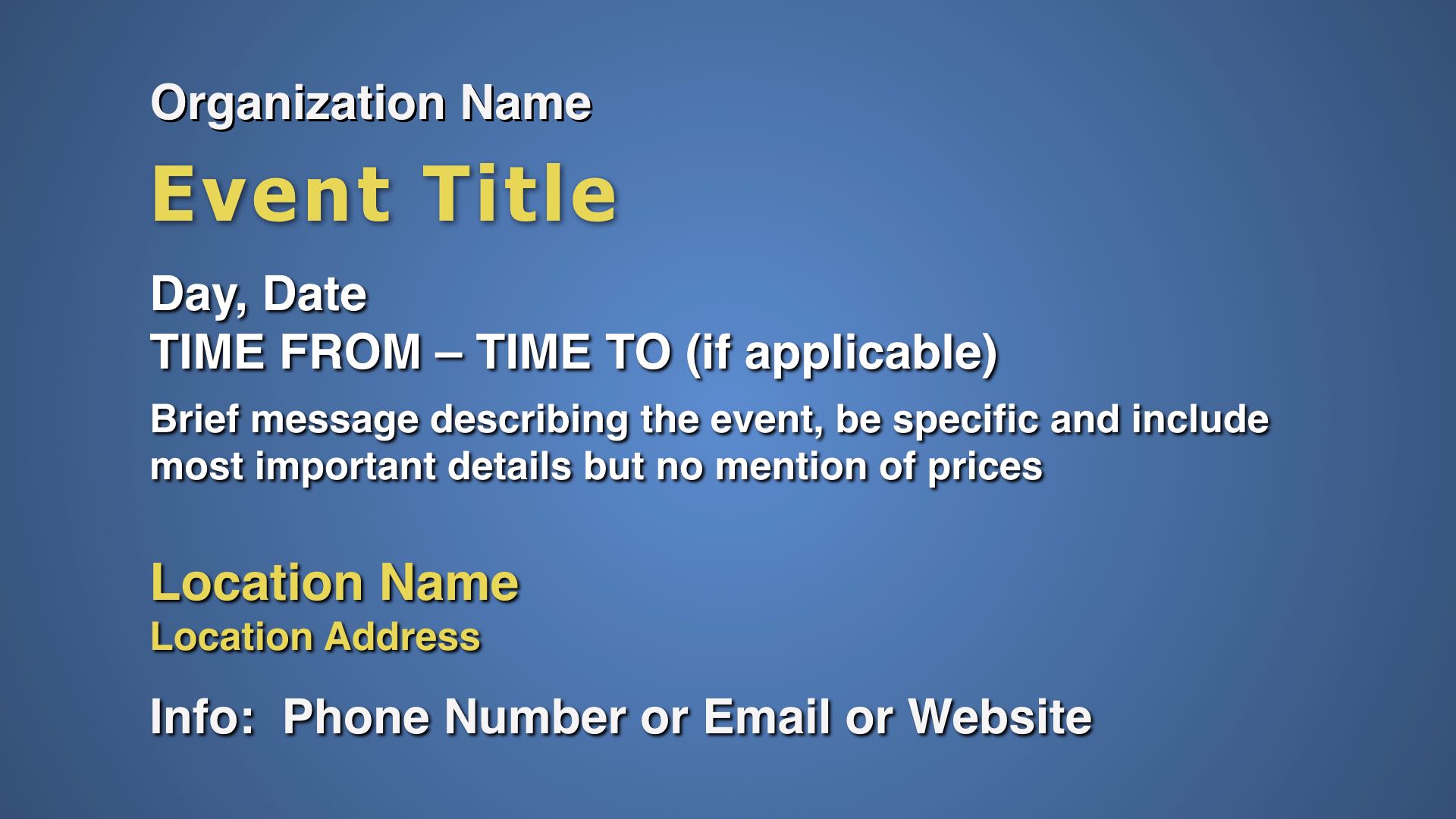 Text messages are displayed on Bremerton Kitsap Access Television (BKAT) in between programs. The BKAT Community Bulletin Board (formerly BKAT Reader Board) is a free public service available ONLY to non-profit organizations, government agencies and schools in Kitsap County. Direct solicitations for financial contributions, commercial or political advertisements are not accepted. BKAT reserves the right to screen the BKAT Reader Board messages and to air selected announcements on a time available basis. BKAT reserves the right to trim submittals to fit the available space. Messages run for two weeks maximum. By granting your approval below, you agree to hold harmless BKAT, the City of Bremerton and Kitsap County from all liability, damages or losses incured because of actions, errors or omissions related to our use of the BKAT Reader Board. This form MUST be completely filled out and signed or the message will not run.